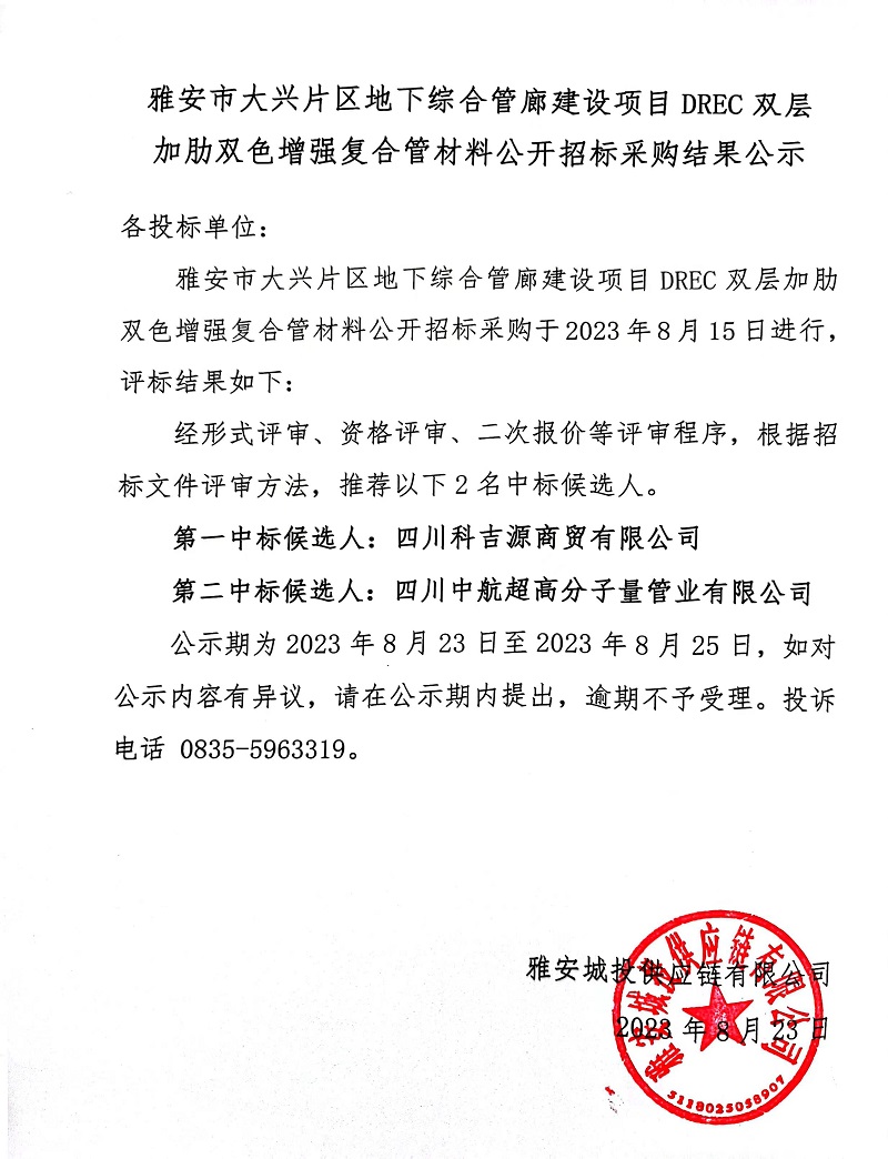 雅安市大興片區(qū)地下綜合管廊建設(shè)項(xiàng)目DREC雙層加肋雙色增強(qiáng)復(fù)合管材料公開(kāi)招標(biāo)采購(gòu)結(jié)果公示