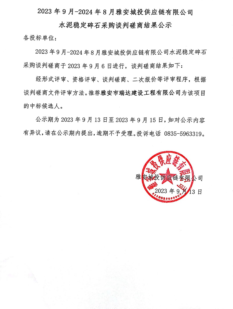 2023年9月-2024年8月雅安城投供應鏈有限公司水泥穩(wěn)定碎石采購談判磋商結(jié)果公示