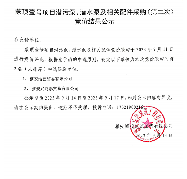 蒙頂壹號項(xiàng)目潛污泵、潛水泵及相關(guān)配件采購(第二次)競價(jià)結(jié)果公示
