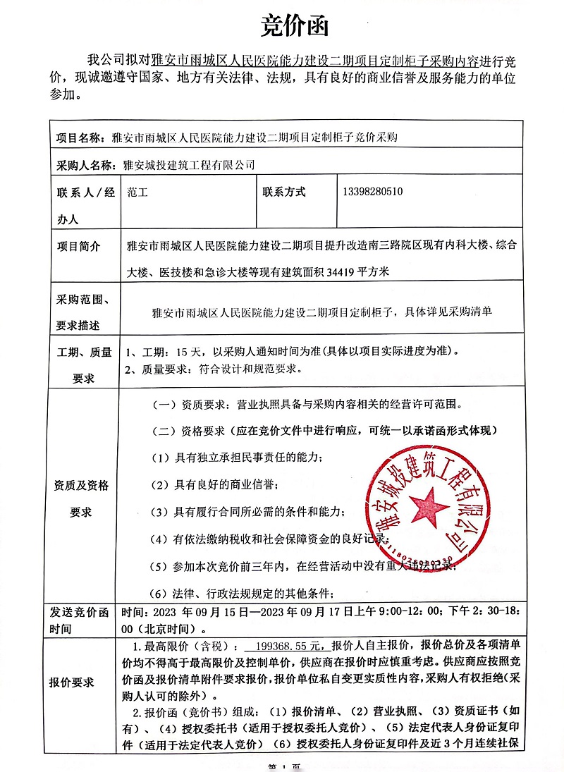 雅安市雨城區(qū)人民醫(yī)院能力建設(shè)二期項(xiàng)目定制柜子采購競價公告