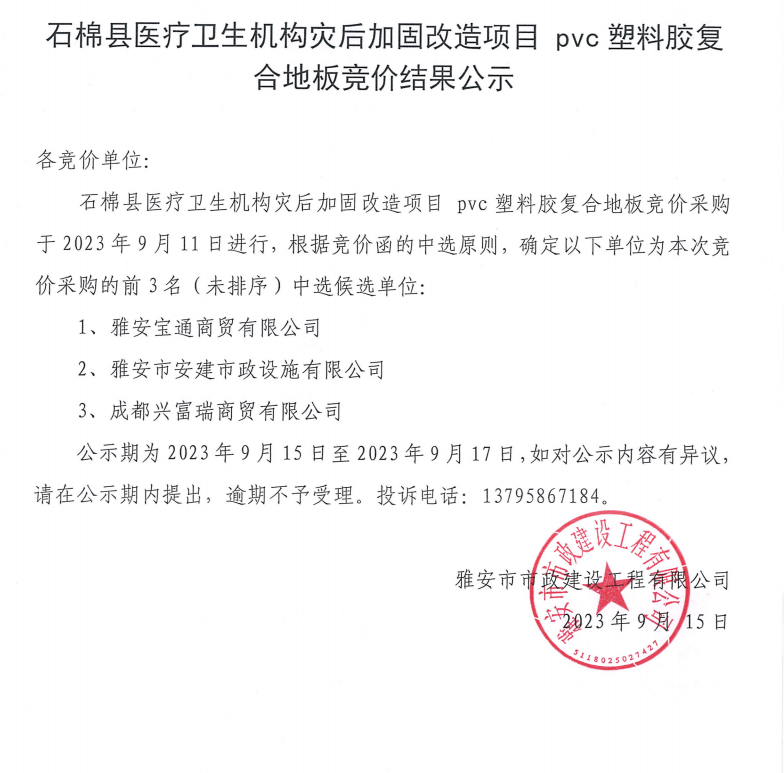 石棉縣醫(yī)療衛(wèi)生機(jī)構(gòu)災(zāi)后加固改造項(xiàng)目pvc塑料膠復(fù)合地板采購競價結(jié)果公示
