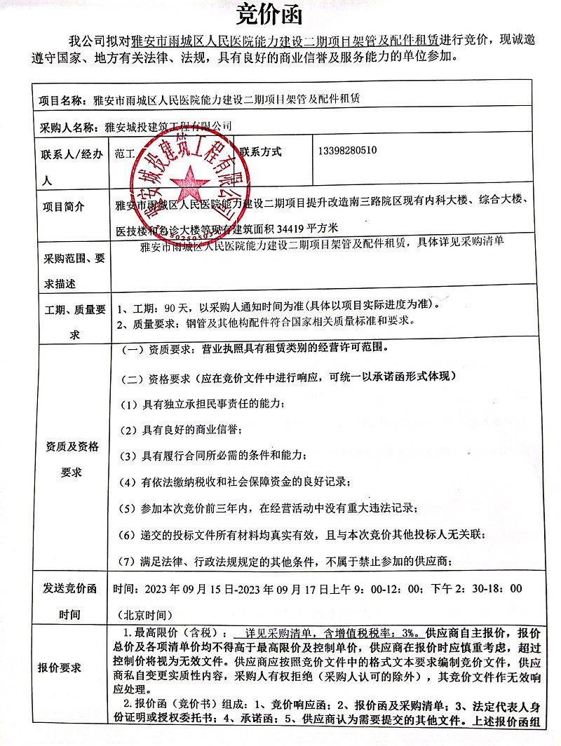 雅安市雨城區(qū)人民醫(yī)院能力建設(shè)二期項(xiàng)目架管及配件租賃競(jìng)價(jià)公告