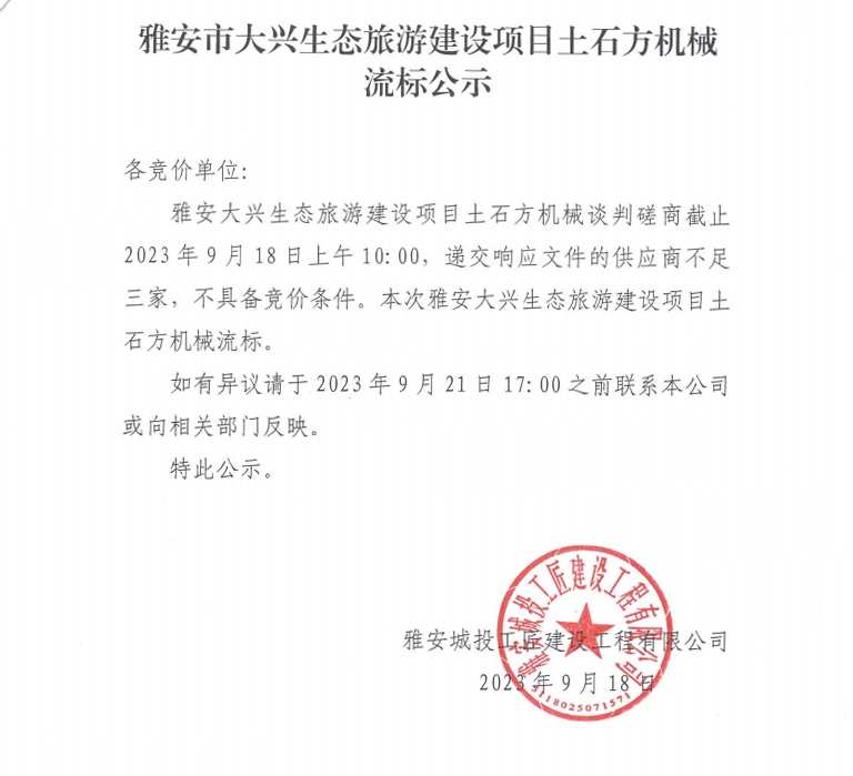 雅安市大興生態(tài)旅游建設(shè)項目土石方機械流標公示