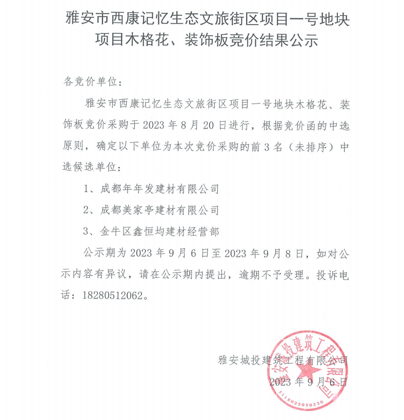 雅安市西康記憶生態(tài)文旅街區(qū)項(xiàng)目一號地塊項(xiàng)目木格花、裝飾板競價(jià)結(jié)果公示