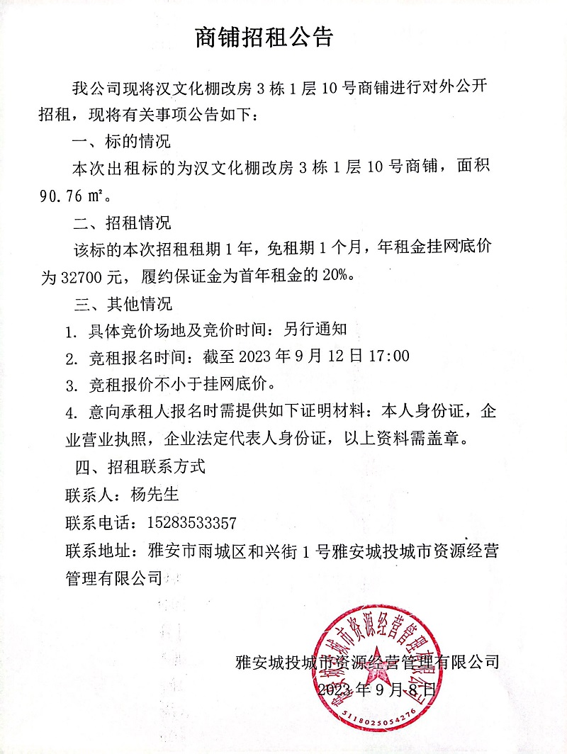 漢文化棚改房3棟1層10號(hào)商鋪招租公告