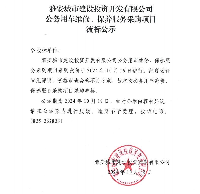 雅安城市建設(shè)投資開發(fā)有限公司公務(wù)用車維修、保養(yǎng)服務(wù)采購項(xiàng)目流標(biāo)公示
