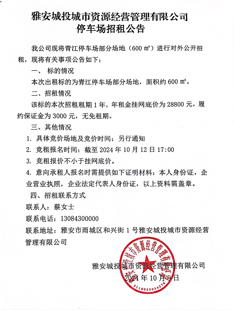 雅安城投城市資源經(jīng)營(yíng)管理有限公司關(guān)于青江停車(chē)場(chǎng)部分場(chǎng)地招租的公告