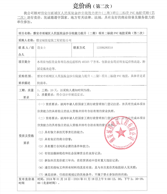 雅安市雨城區(qū)人民醫(yī)院金沙分院能力提升(二期)項目二標段PVC地膠采購(第二次)競價公告