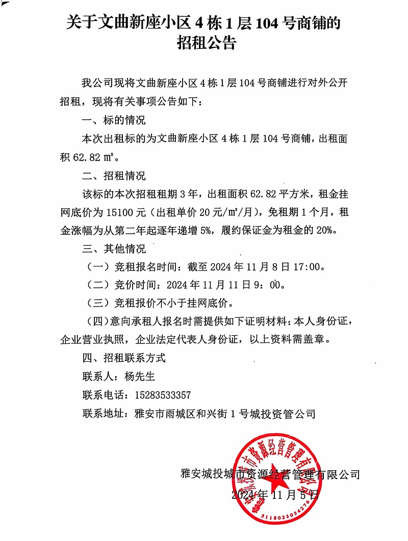 關(guān)于文曲新座小區(qū)4棟1層104號商鋪的招租公告