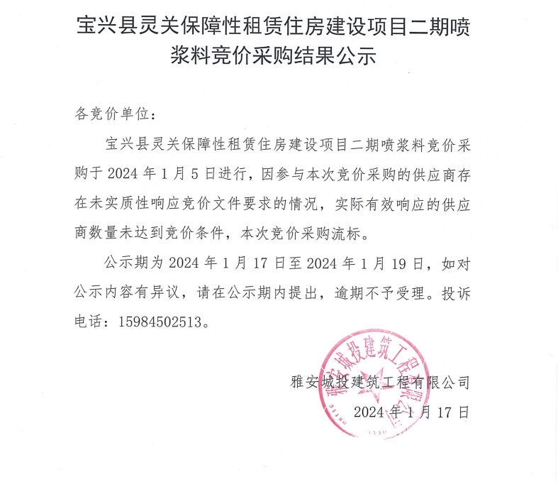 寶興縣靈關保障性租賃住房建設項目二期噴漿料競價采購結果公示