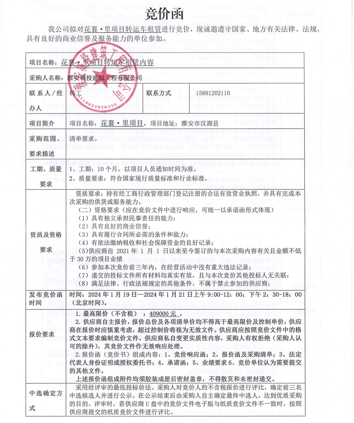 花襄·里項目轉(zhuǎn)運車租賃競價公告