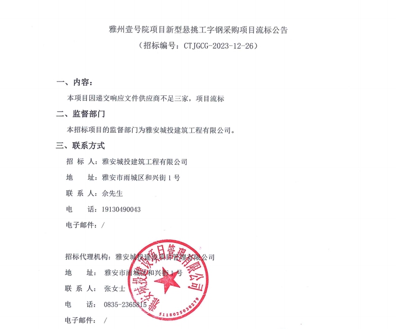 雅州壹號(hào)院項(xiàng)目新型懸挑工字鋼采購(gòu)項(xiàng)目流標(biāo)公告