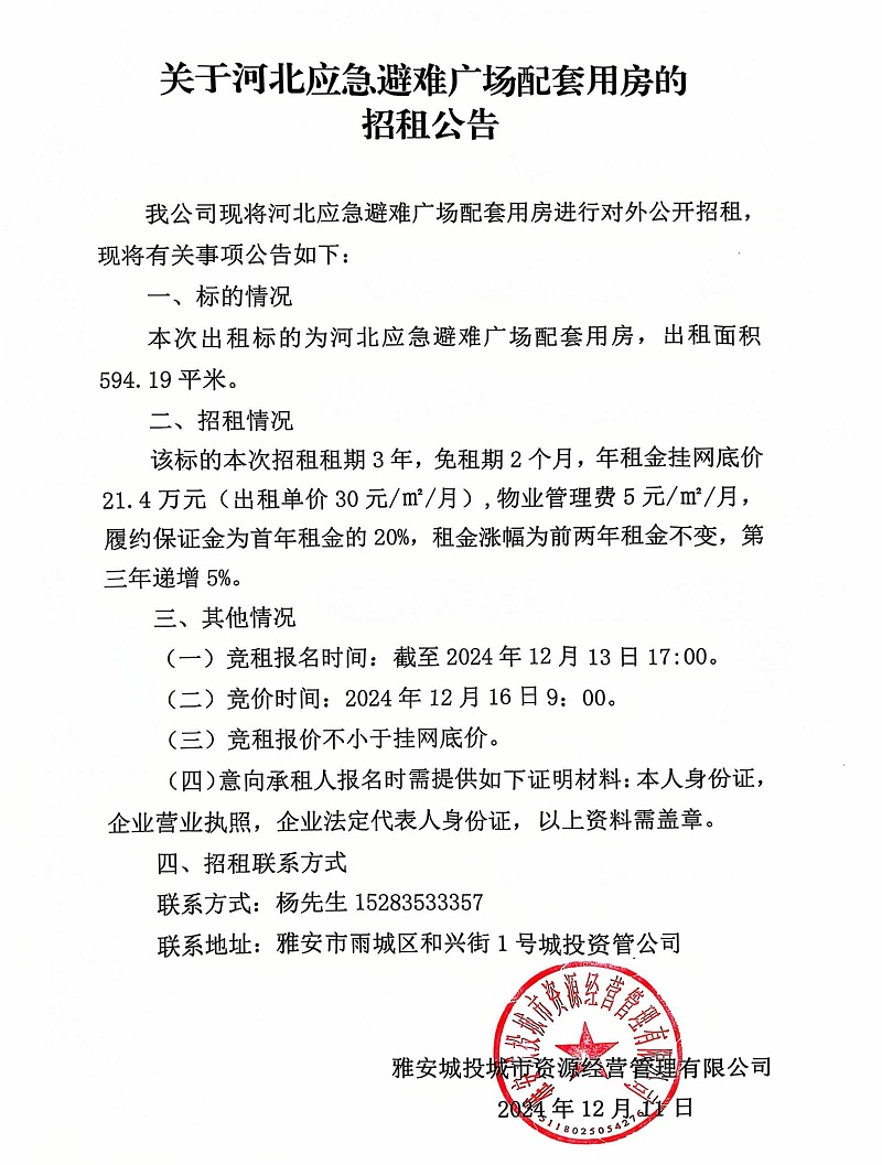 關(guān)于河北應(yīng)急避難廣場配套用房的招租公告