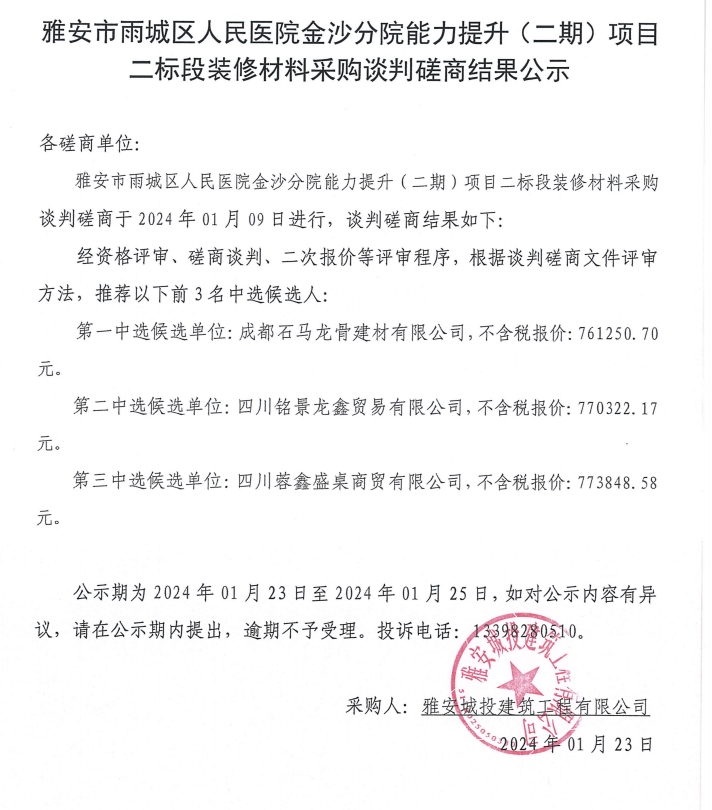 雅安市雨城區(qū)人民醫(yī)院金沙分院能力提升(二期)項(xiàng)目二標(biāo)段裝修材料采購談判磋商結(jié)果公示