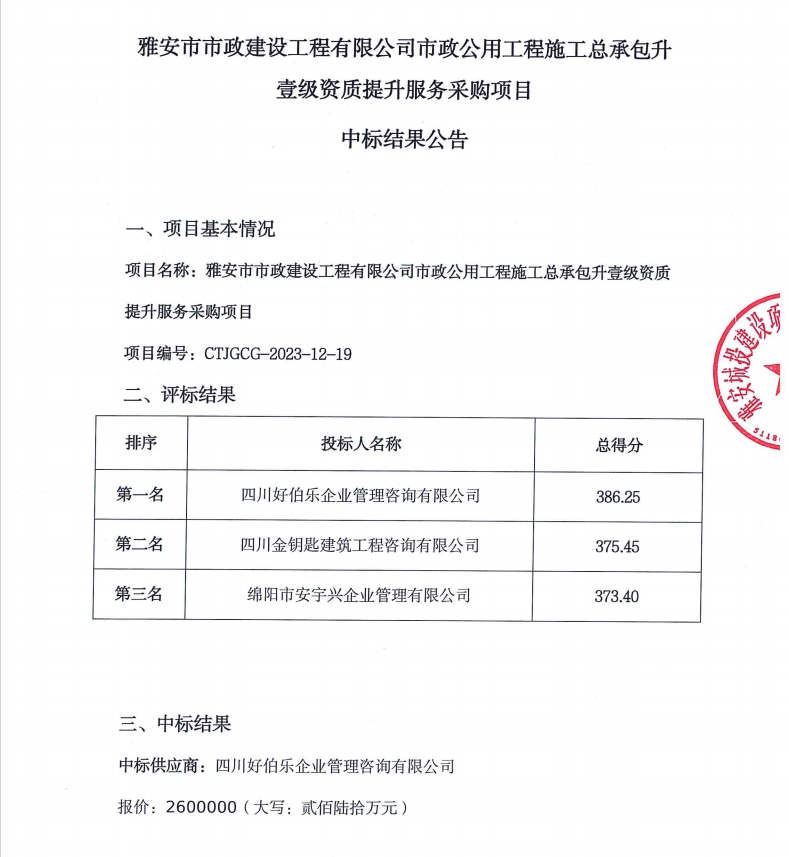 雅安市市政建設(shè)工程有限公司市政公用工程施工總承包升壹級(jí)資質(zhì)提升服務(wù)采購(gòu)項(xiàng)目中標(biāo)結(jié)果公告