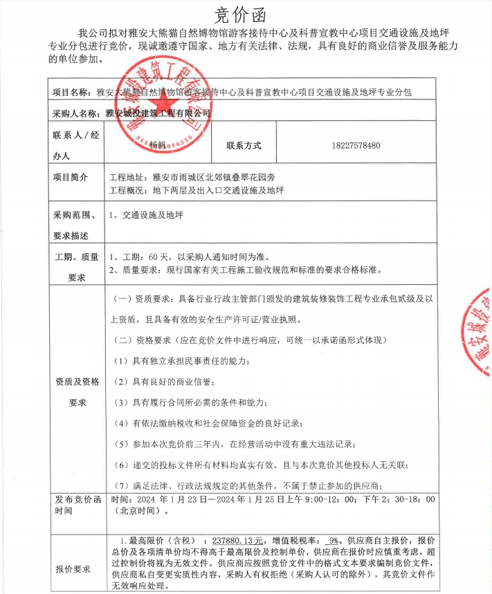 雅安大熊貓自然博物館游客接待中心及科普宣教中心項(xiàng)目交通設(shè)施及地坪專(zhuān)業(yè)分包競(jìng)價(jià)公告