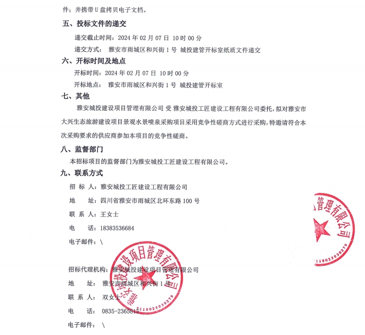 雅安市大興生態(tài)旅游建設(shè)項(xiàng)目景觀水景噴泉采購(gòu)項(xiàng)目公告