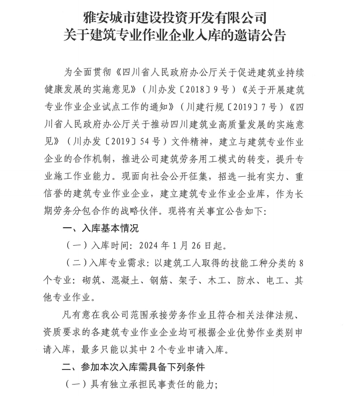 雅安城市建設(shè)投資開發(fā)有限公司關(guān)于建筑專業(yè)作業(yè)企業(yè)入庫的邀請(qǐng)公告
