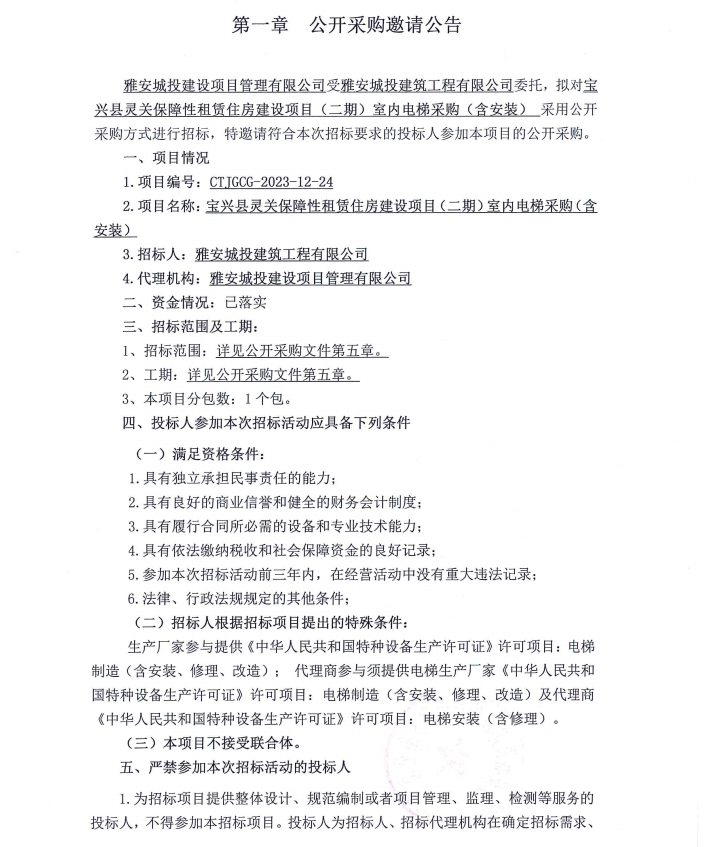 寶興縣靈關(guān)保障性租賃住房建設(shè)項目(二期)室內(nèi)電梯采購(含安裝)公開采購邀請公告