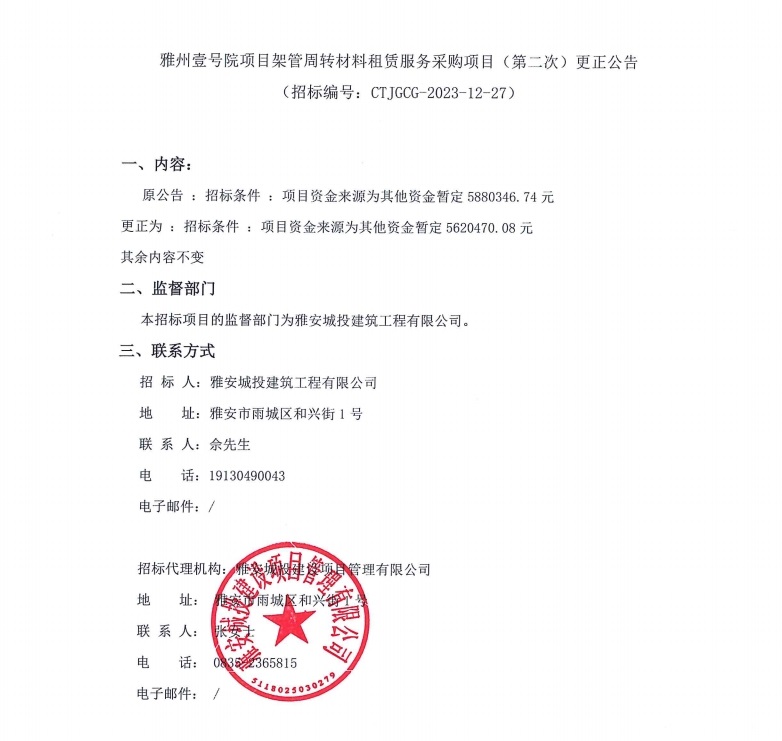 雅州壹號(hào)院項(xiàng)目架管周轉(zhuǎn)材料租賃服務(wù)采購項(xiàng)目(第二次)更正公告