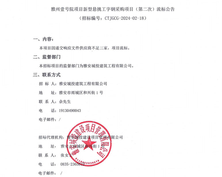 雅州壹號院項目新型懸挑工字鋼采購項目(第二次)流標(biāo)公告
