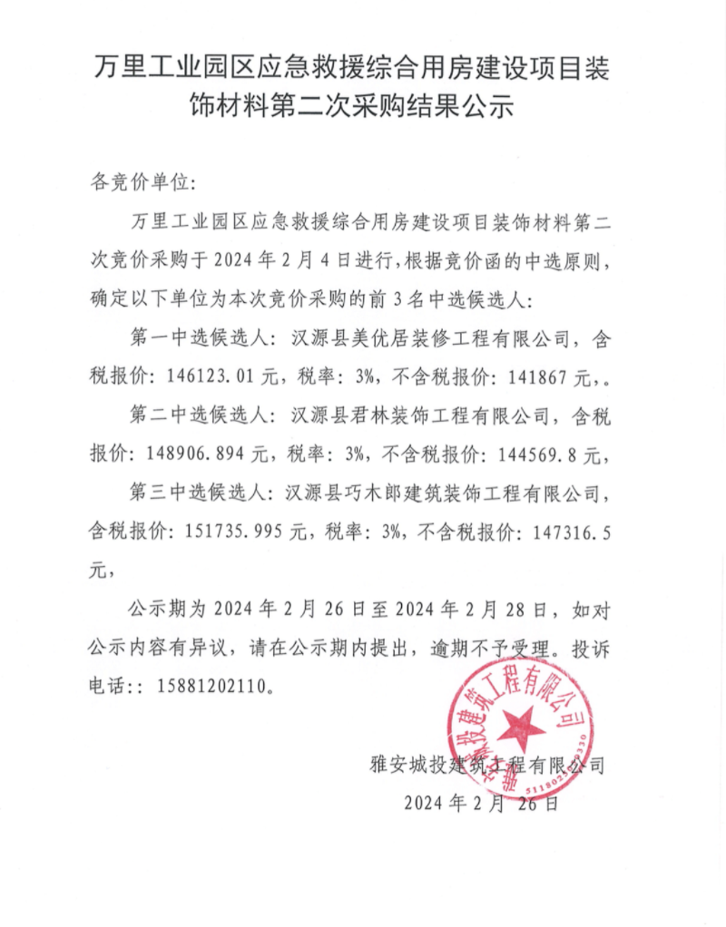 萬里工業(yè)園區(qū)應(yīng)急救援綜合用房建設(shè)項目裝飾材料第二次采購結(jié)果公示