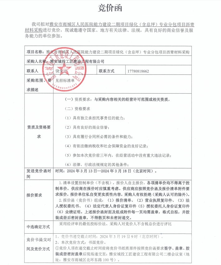 雅安市雨城區(qū)人民醫(yī)院能力建設(shè)二期項(xiàng)目綠化(含總坪)專業(yè)分包項(xiàng)目瀝青材料采購競價(jià)公告