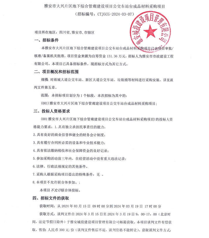 雅安市大興片區(qū)地下綜合管廊建設(shè)項目公交車站臺成品材料采購項目公告