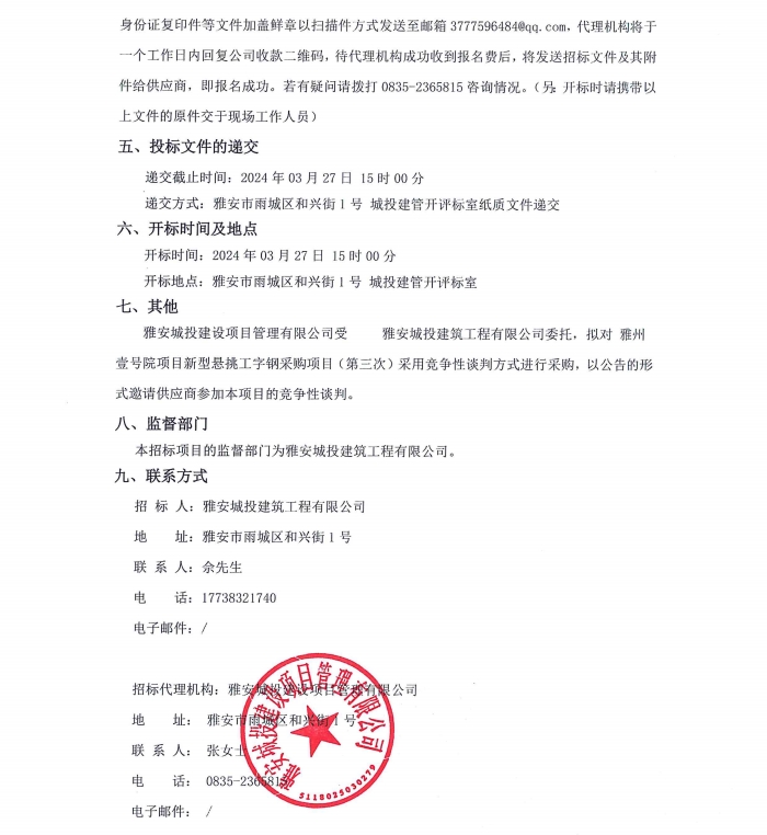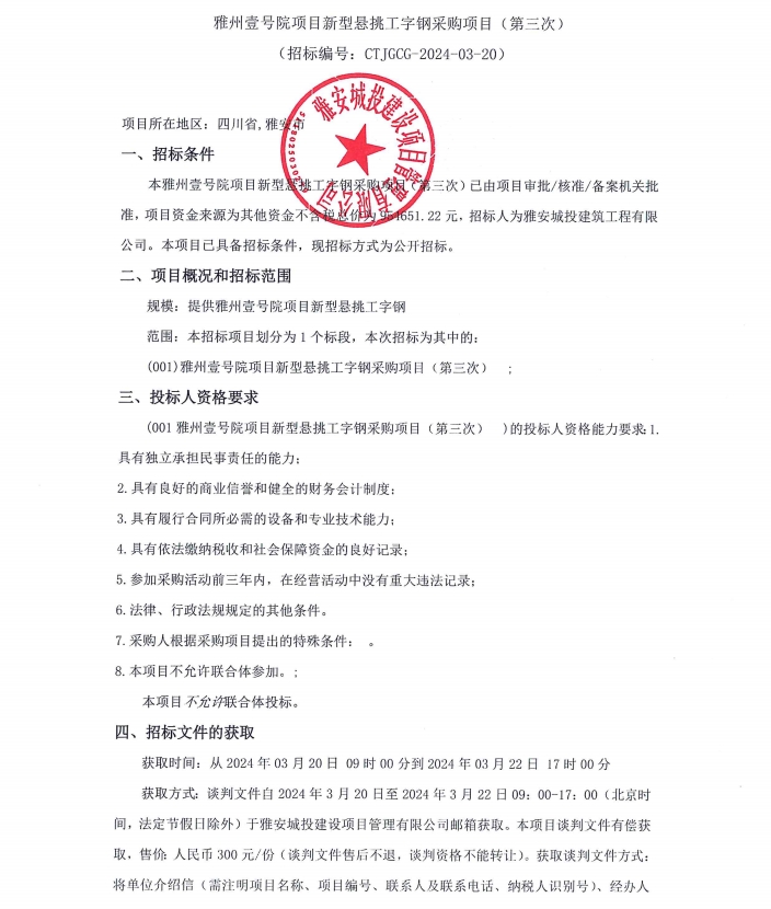 雅州壹號院項目新型懸挑工字鋼采購(第三次)公告