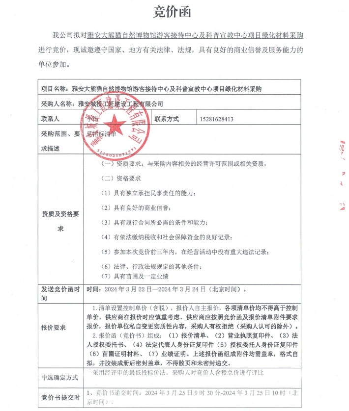 雅安大熊貓自然博物館游客接待中心及科普宣教中心項(xiàng)目綠化材料采購競(jìng)價(jià)公告