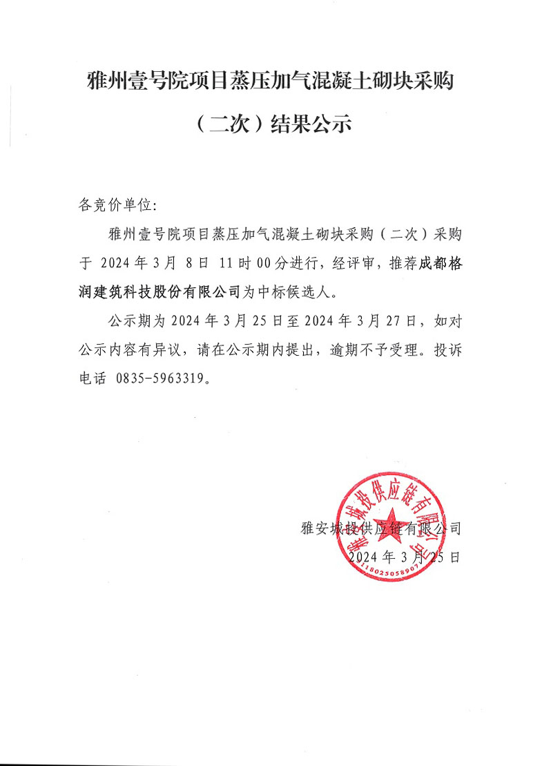 雅州壹號(hào)院項(xiàng)目蒸壓加氣混凝土砌塊采購(gòu)(第二次)結(jié)果公示