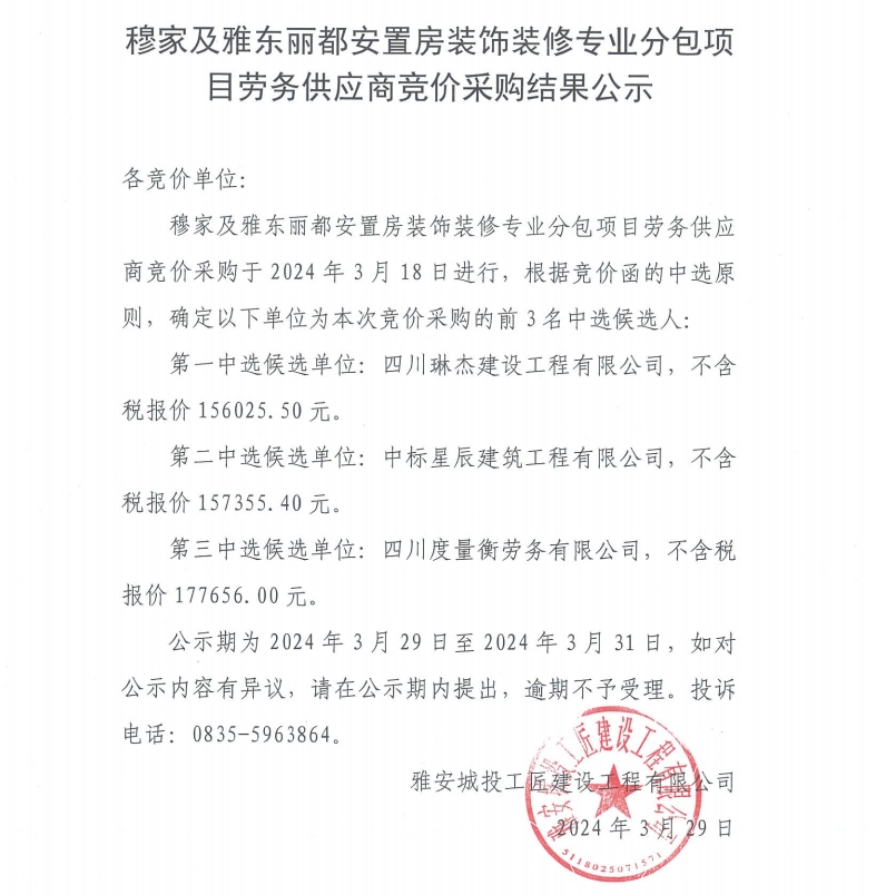 穆家及雅東麗都安置房裝飾裝修專業(yè)分包項(xiàng)目勞務(wù)供應(yīng)商采購競(jìng)價(jià)采購結(jié)果公示