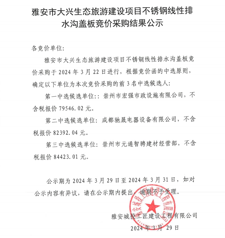 雅安市大興生態(tài)旅游建設(shè)項(xiàng)目不銹鋼線性排水溝蓋板競價(jià)采購結(jié)果公示