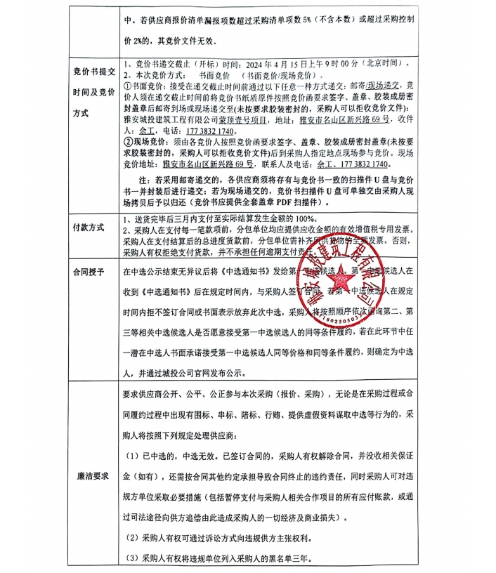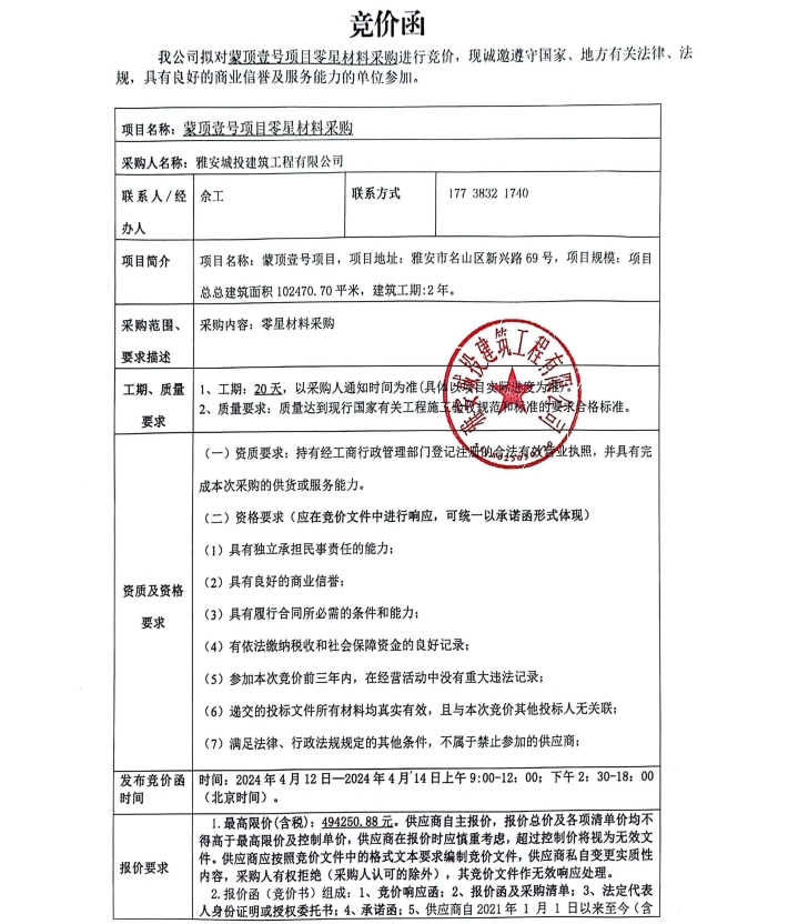 蒙頂壹號項目零星材料采購競價公告