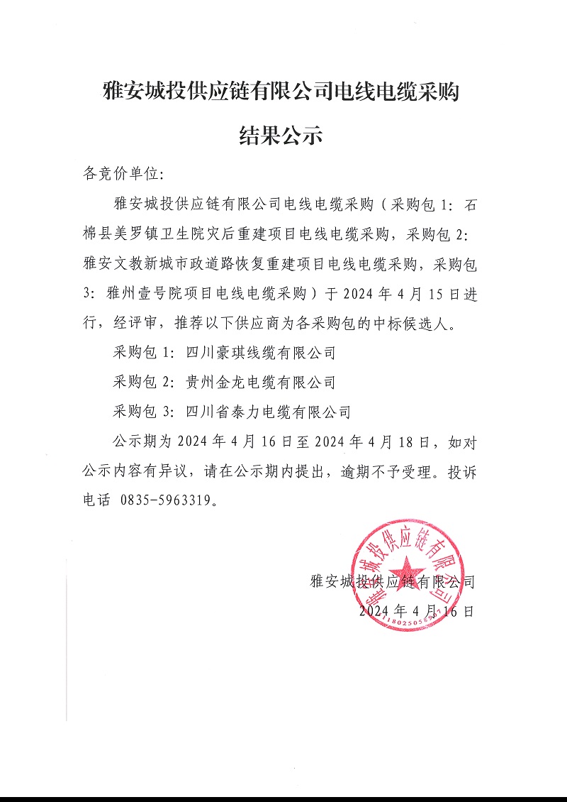 雅安城投供應(yīng)鏈有限公司電線(xiàn)電纜采購(gòu)結(jié)果公示