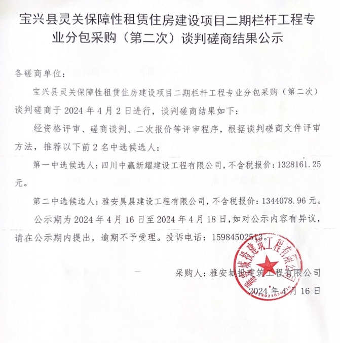 寶興縣靈關保障性租賃住房建設項目二期欄桿工程專業(yè)分包采購(第二次)談判磋商結(jié)果公示