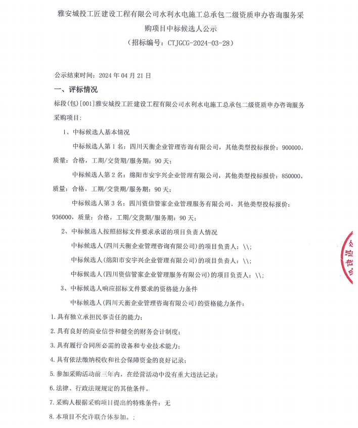 雅安城投工匠建設(shè)工程有限公司水利水電施工總承包二級(jí)資質(zhì)申辦咨詢服務(wù)采購(gòu)項(xiàng)目中標(biāo)候選人公示