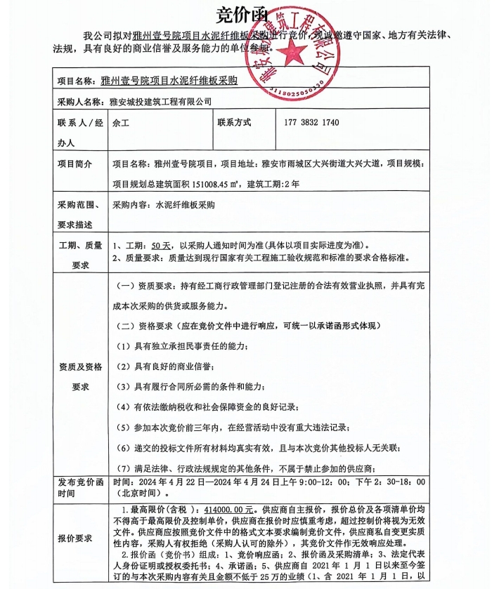 雅州壹號(hào)院項(xiàng)目水泥纖維板采購(gòu)競(jìng)價(jià)公告