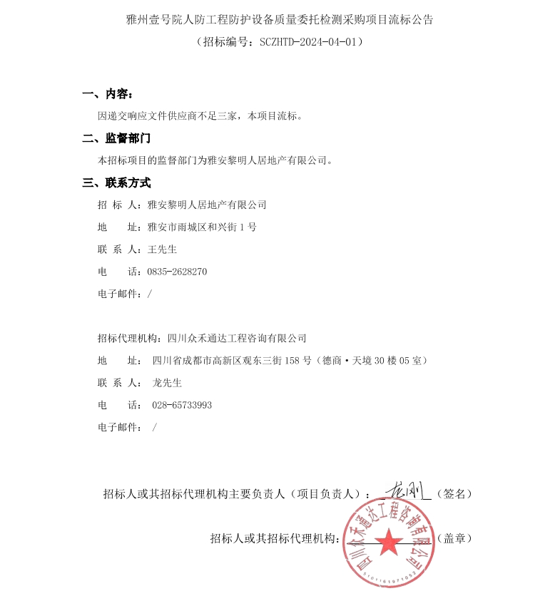 雅州壹號院人防工程防護(hù)設(shè)備質(zhì)量委托檢測采購項目流標(biāo)公告