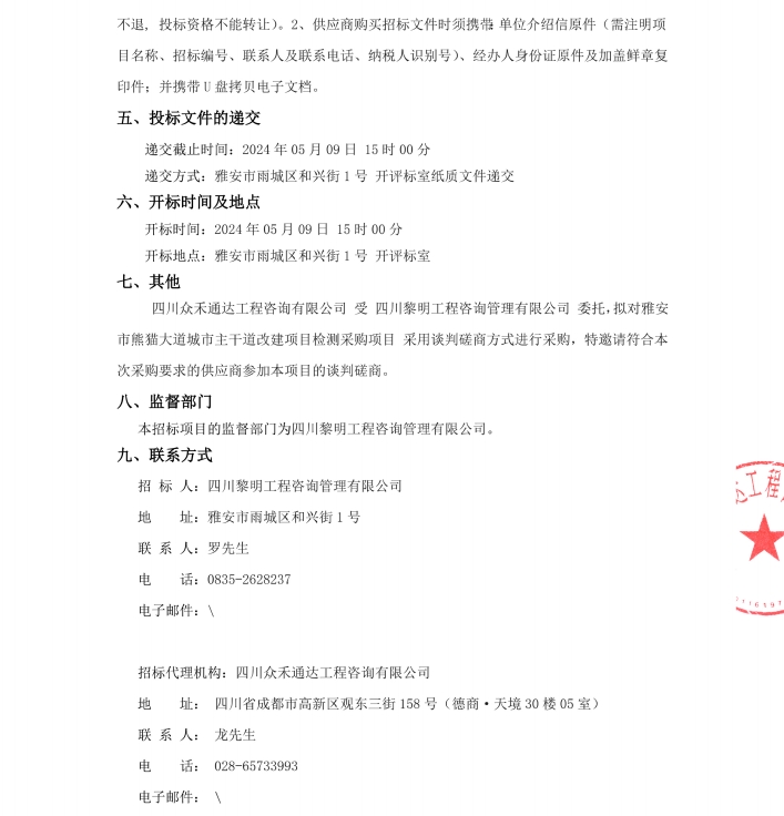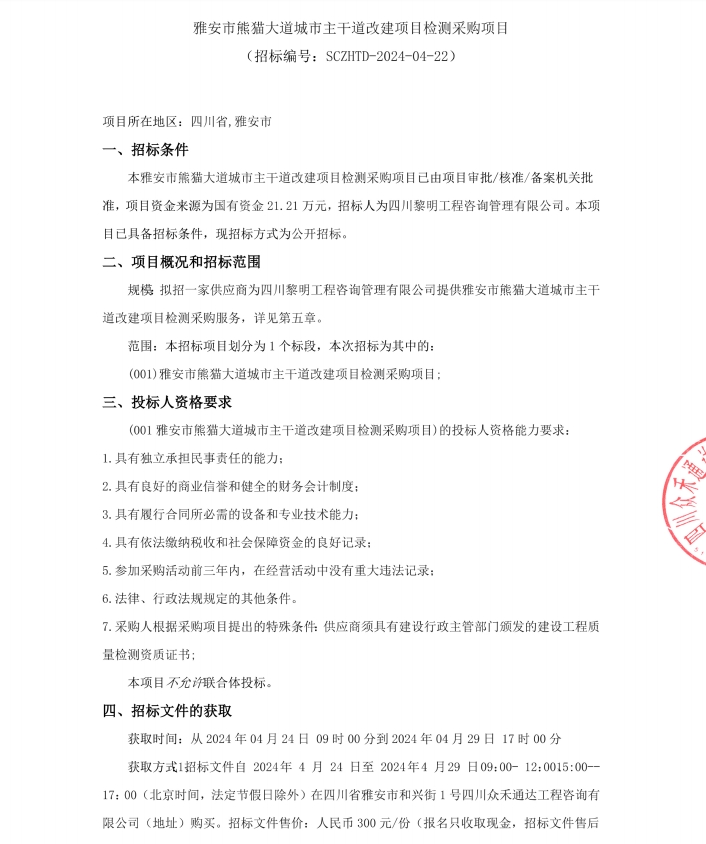 雅安市熊貓大道城市主干道改造項(xiàng)目檢測(cè)采購(gòu)項(xiàng)目公告