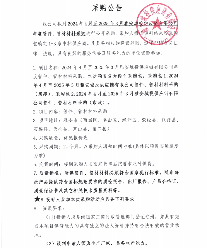 2024年4月至2025年3月雅安城投供應鏈有限公司年度管件、管材材料采購公告