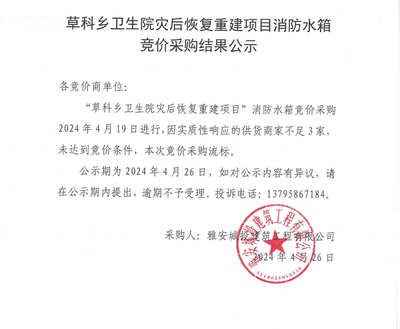 草科鄉(xiāng)衛(wèi)生院災(zāi)后恢復(fù)重建項(xiàng)目消防水箱競(jìng)價(jià)采購(gòu)結(jié)果公示