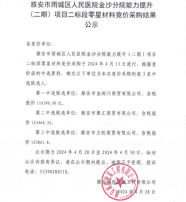 雅安市雨城區(qū)人民醫(yī)院金沙分院能力提升(二期)項(xiàng)目二標(biāo)段零星材料競(jìng)價(jià)采購(gòu)結(jié)果公示