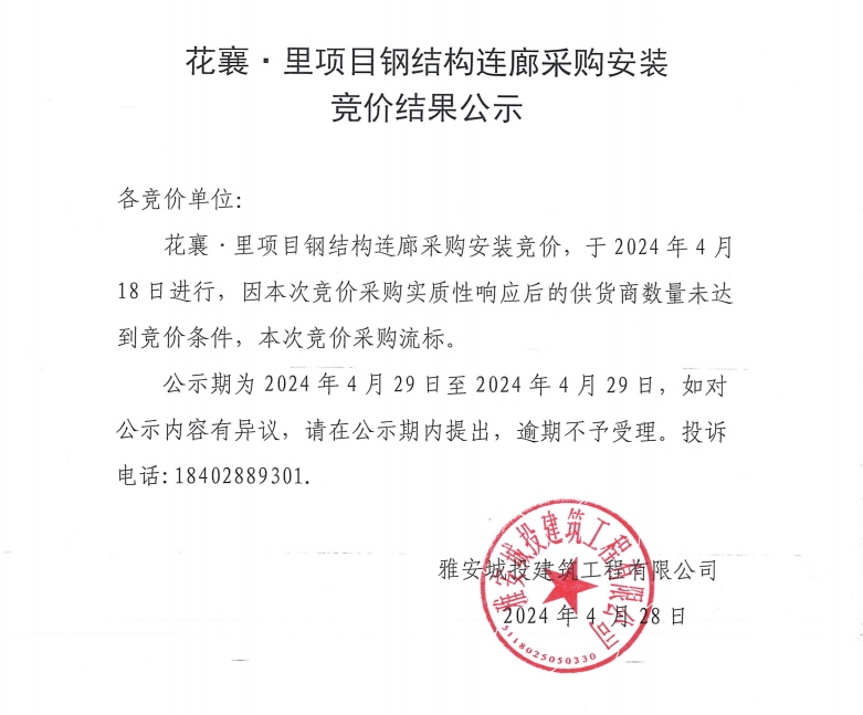 花襄·里項(xiàng)目鋼結(jié)構(gòu)連廊采購安裝競(jìng)價(jià)結(jié)果公示