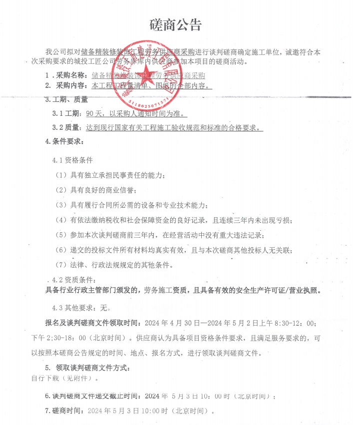 儲備精裝修裝飾工程勞務供應商采購談判磋商公告