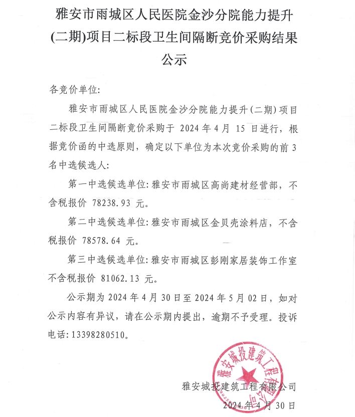 雅安市雨城區(qū)人民醫(yī)院金沙分院能力提升(二期)項目二標段衛(wèi)生間隔斷競價采購結(jié)果公示
