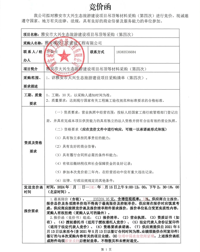 雅安市大興生態(tài)旅游建設(shè)項目吊頂?shù)炔牧喜少彛ǖ谒拇危└們r文件
