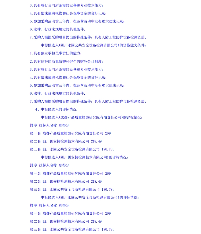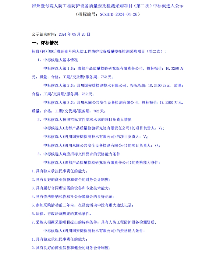 雅州壹號院人防工程防護(hù)設(shè)備質(zhì)量委托檢測采購項目(第二次)中標(biāo)候選人公示