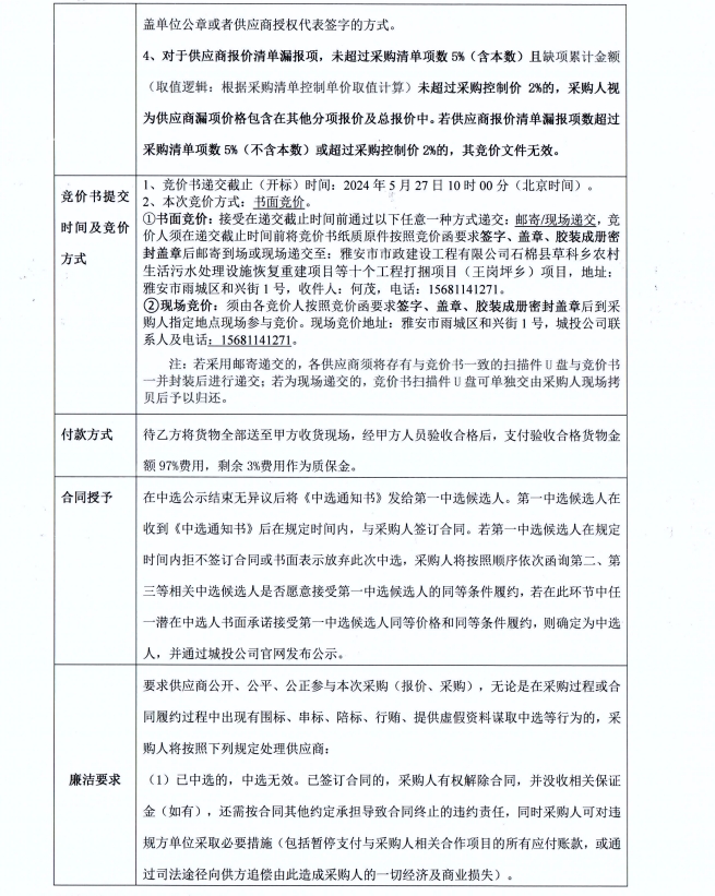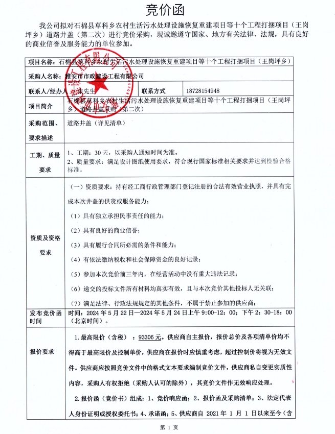 石棉縣草科鄉(xiāng)農(nóng)村生活污水處理設(shè)施恢復(fù)重建項目等十個工程打捆項目(王崗坪鄉(xiāng))道路井蓋競價采購(第二次)競價公告