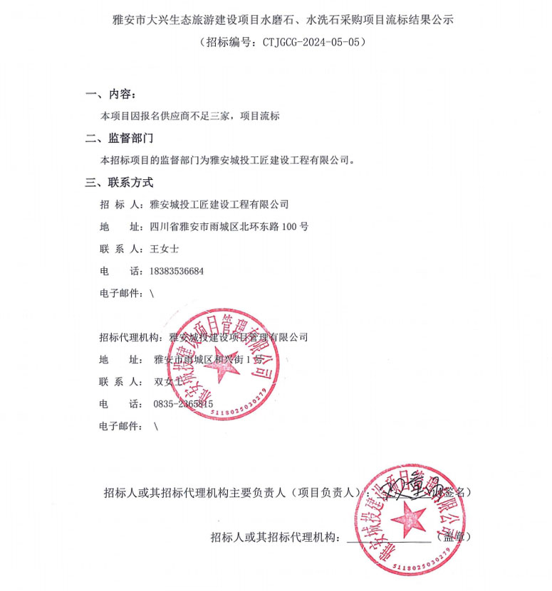 雅安市大興生態(tài)旅游建設(shè)項(xiàng)目水磨石、水洗石采購項(xiàng)目流標(biāo)結(jié)果公示